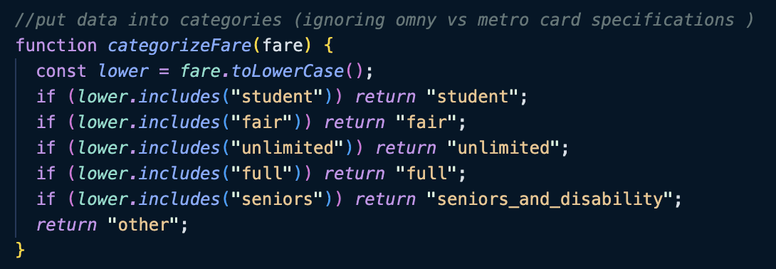 I simplified and consolidated categories to make the dataset easy to parse. For example, I ignored the distinction between OMNY and MTA tickets, as it didn’t provide useful insights for this analysis. Similarly, I grouped 7-day and 30-day unlimited tickets together under a single “unlimited” category to reduce complexity and focus on the most relevant patterns.