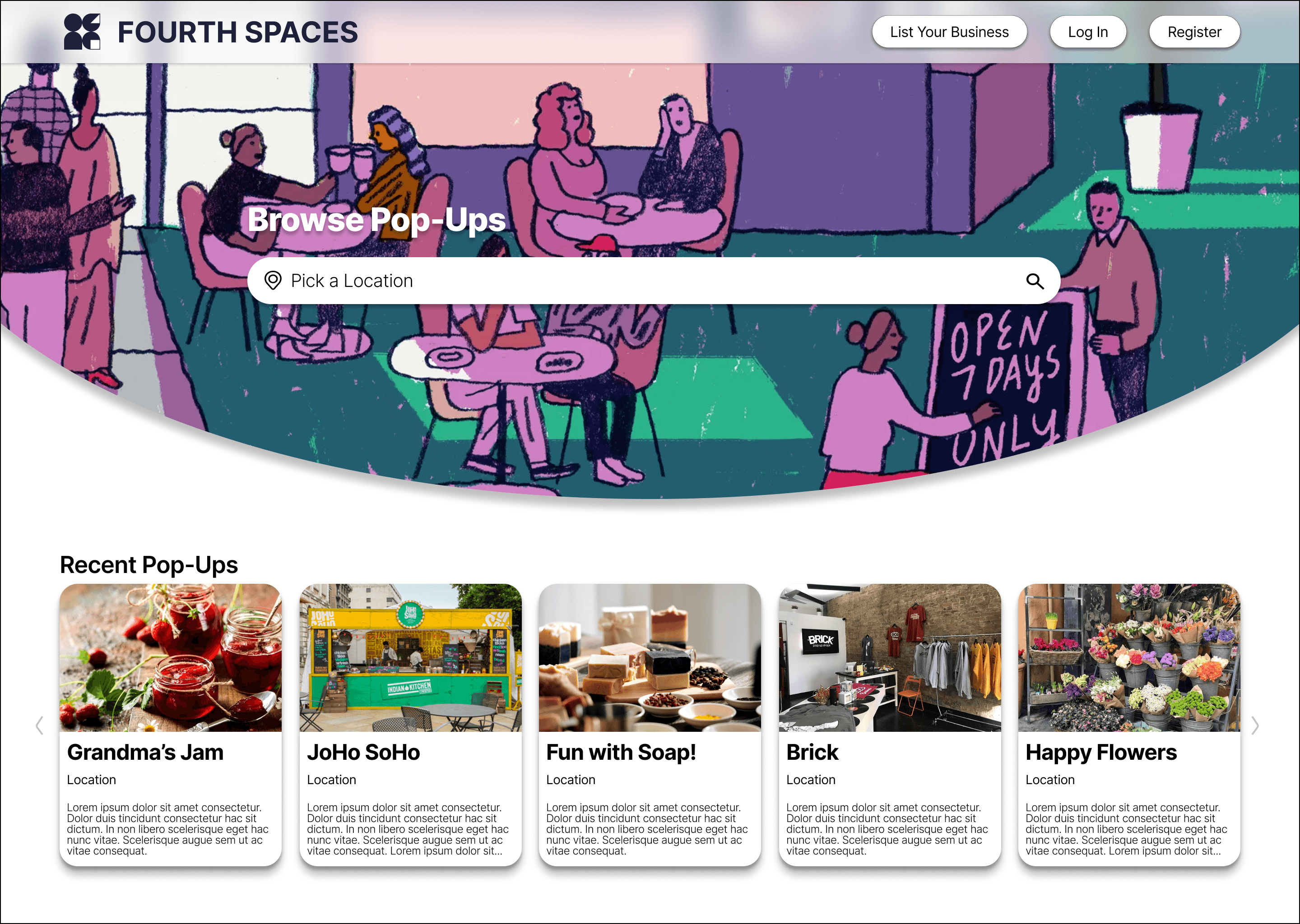 Activates under-utilized spaces through temporary experiences that can grow into long-term establishments (think food truck → restaurant, bake sale → bakery)