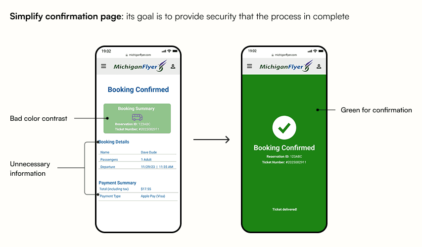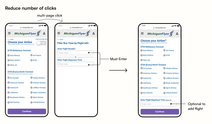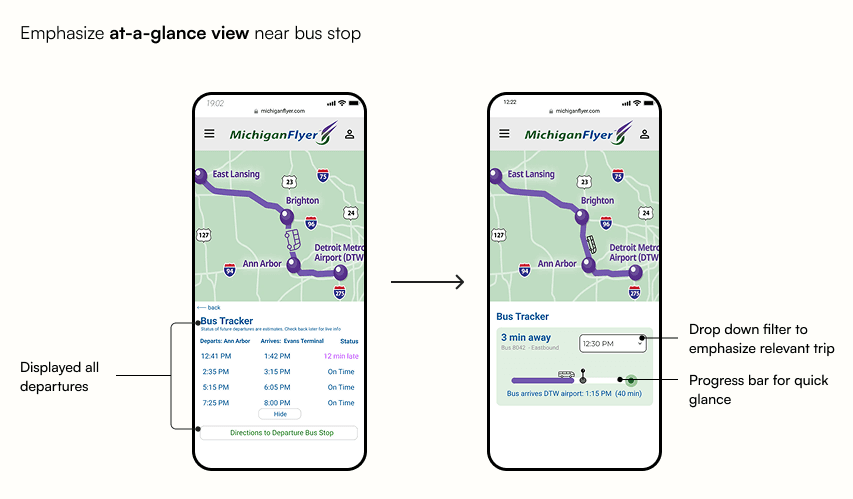 Michigan Flyer is a shuttle service connecting Ann Arbor, East Lansing, and Detroit Metro Airport. While many travelers rely on its mobile site to check schedules, purchase tickets, and plan trips, the current interface can feel cluttered and hard to use on the go.
