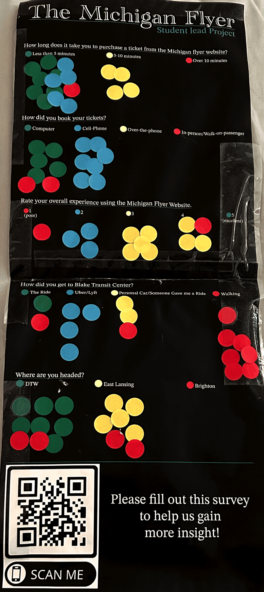 To understand user experiences with the Michigan Flyer, we collected 30+ digital surveys and placed an interactive board at the bus station. This helped us identify the primary users of the website and how they currently navigate and interact with it.
