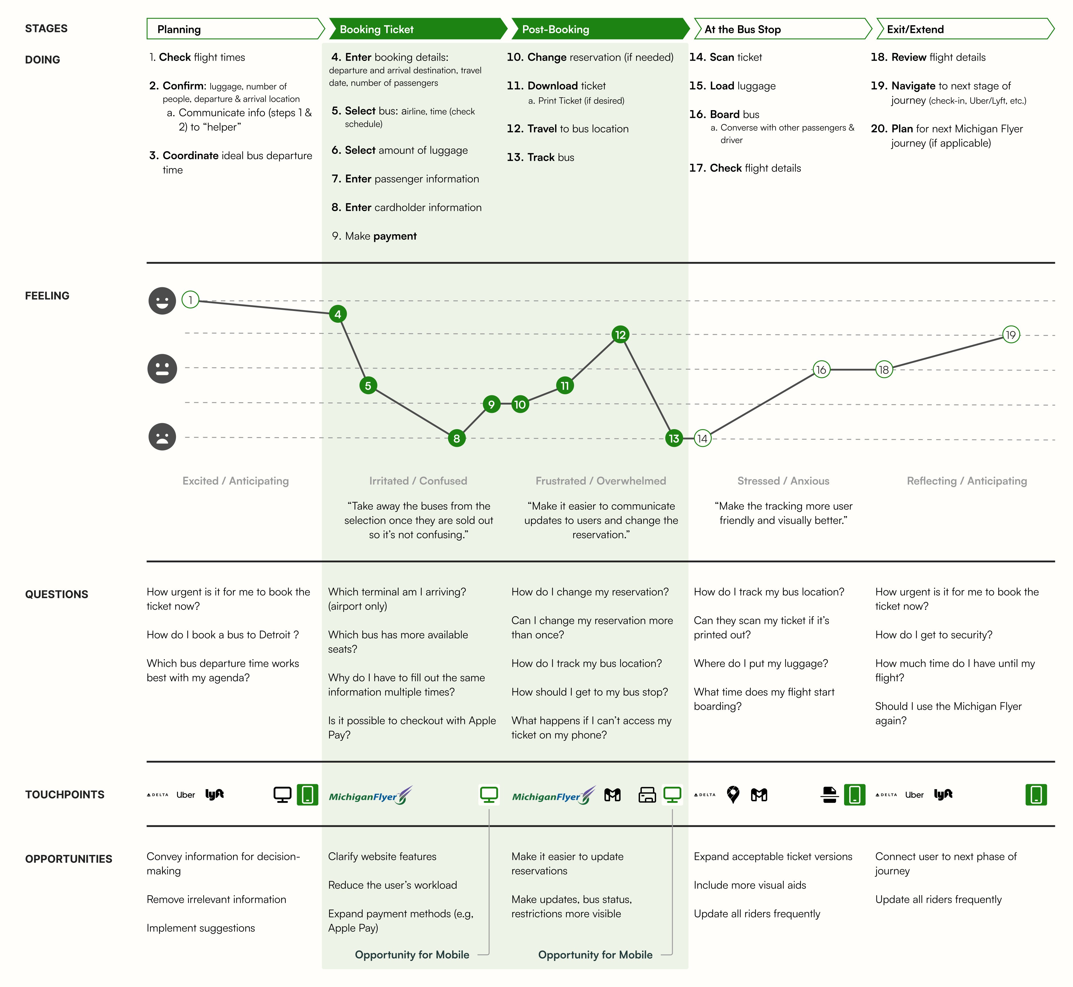 Using these insights, we created a user journey map to highlight pain points and opportunities.