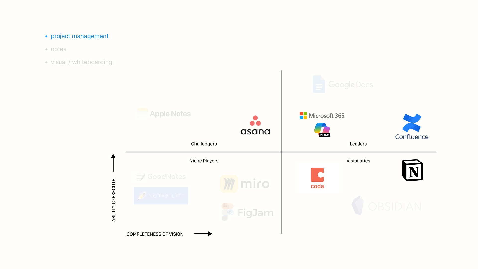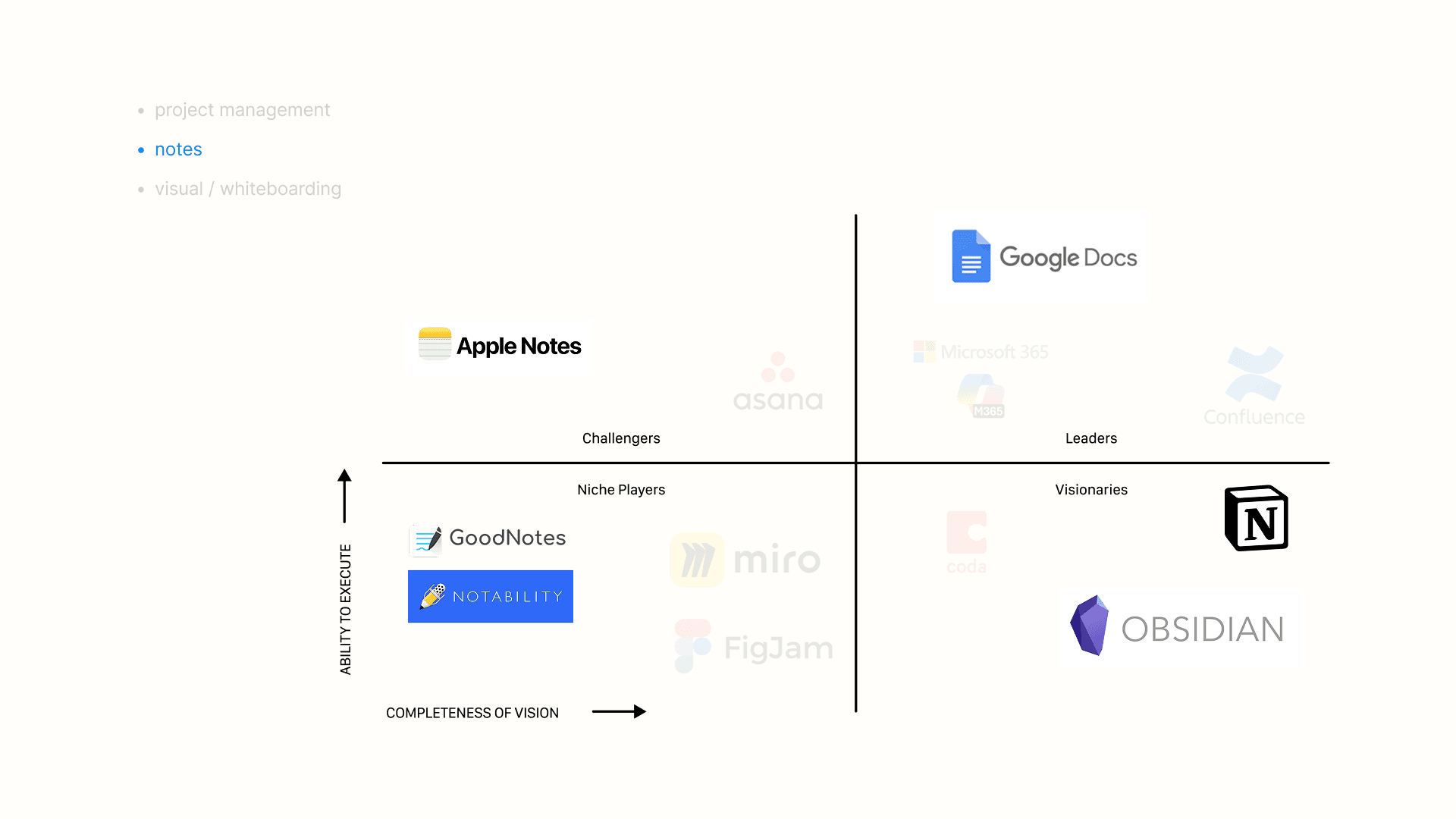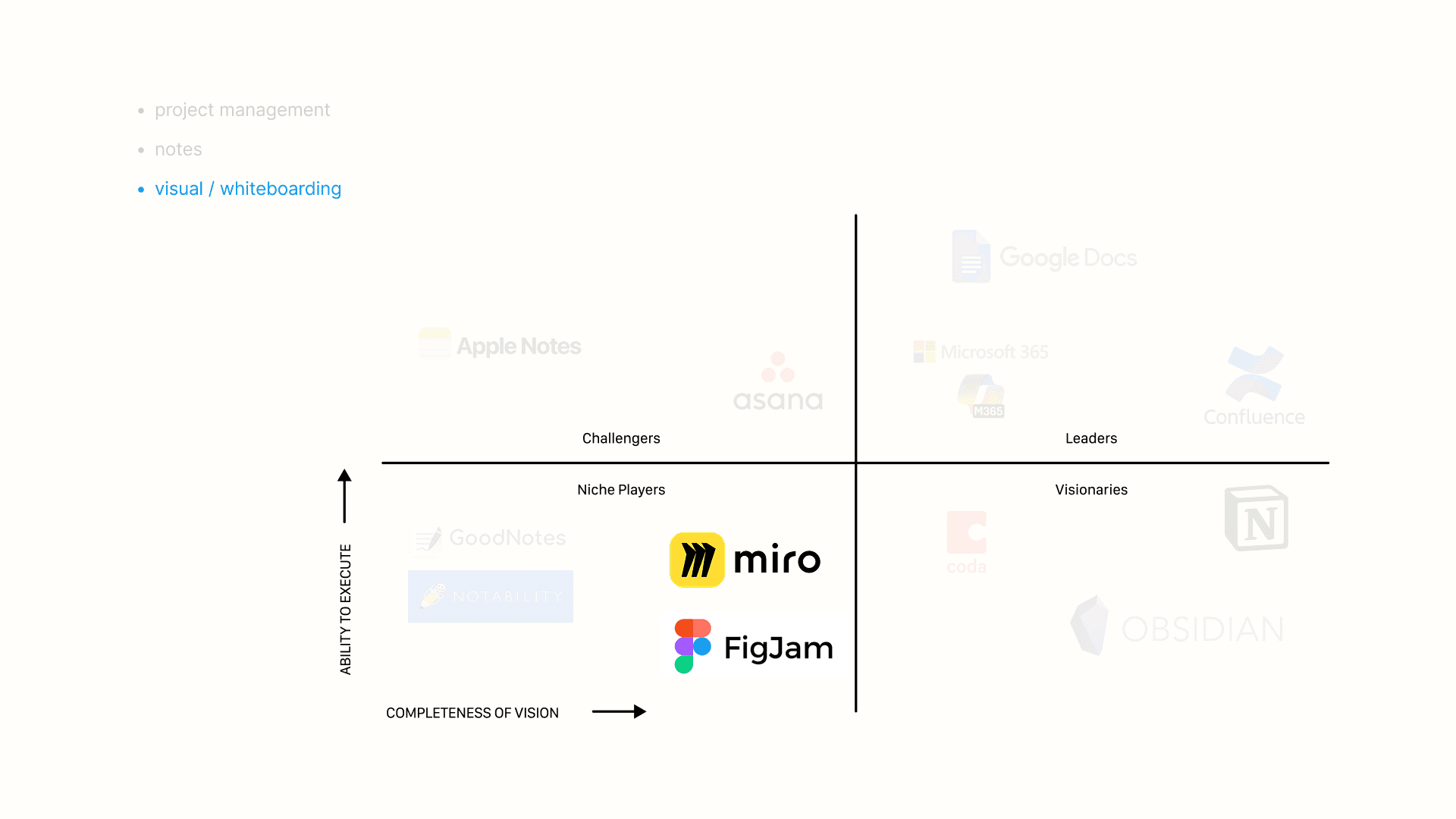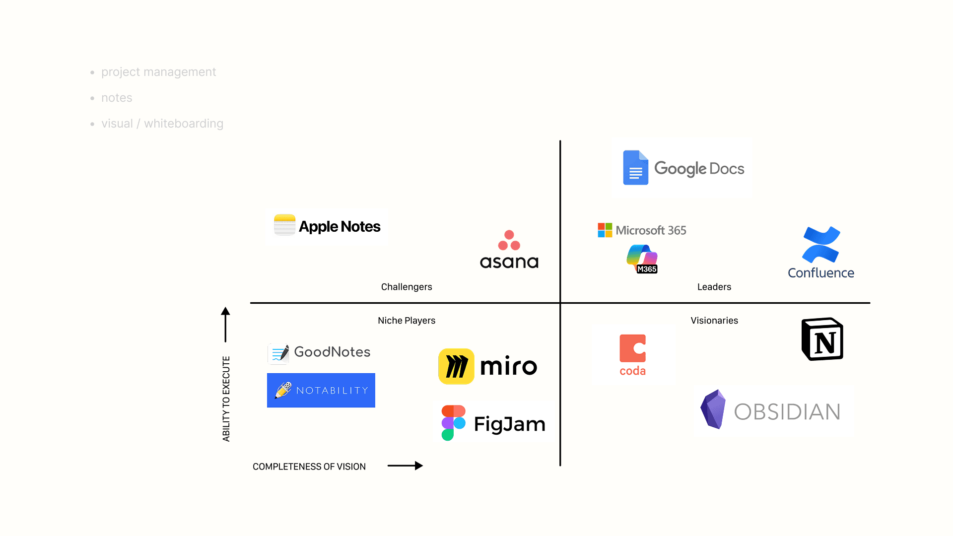 We looked at competitors and mapped them out using a Gartner Magic Quadrant to understand how these tools differentiate themselves in terms of vision and capability.