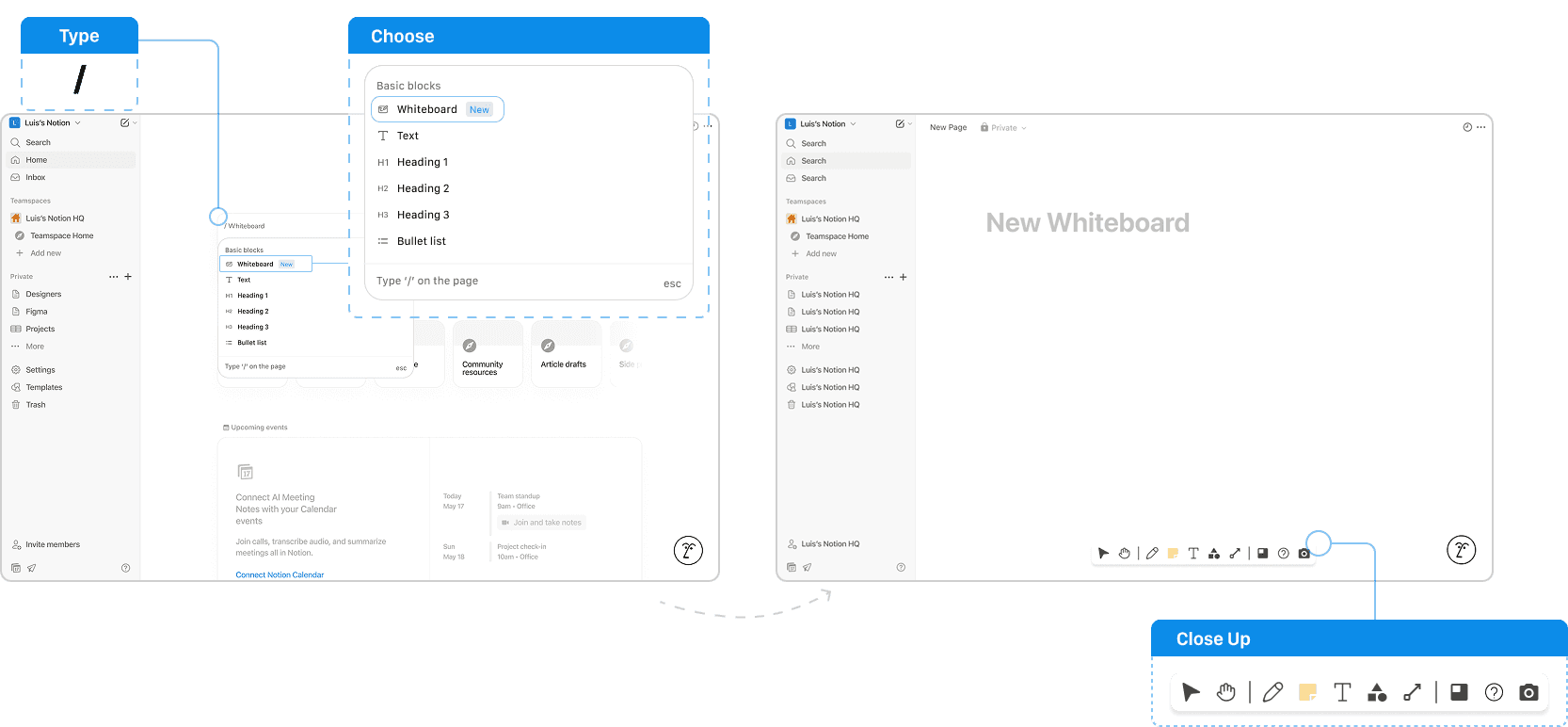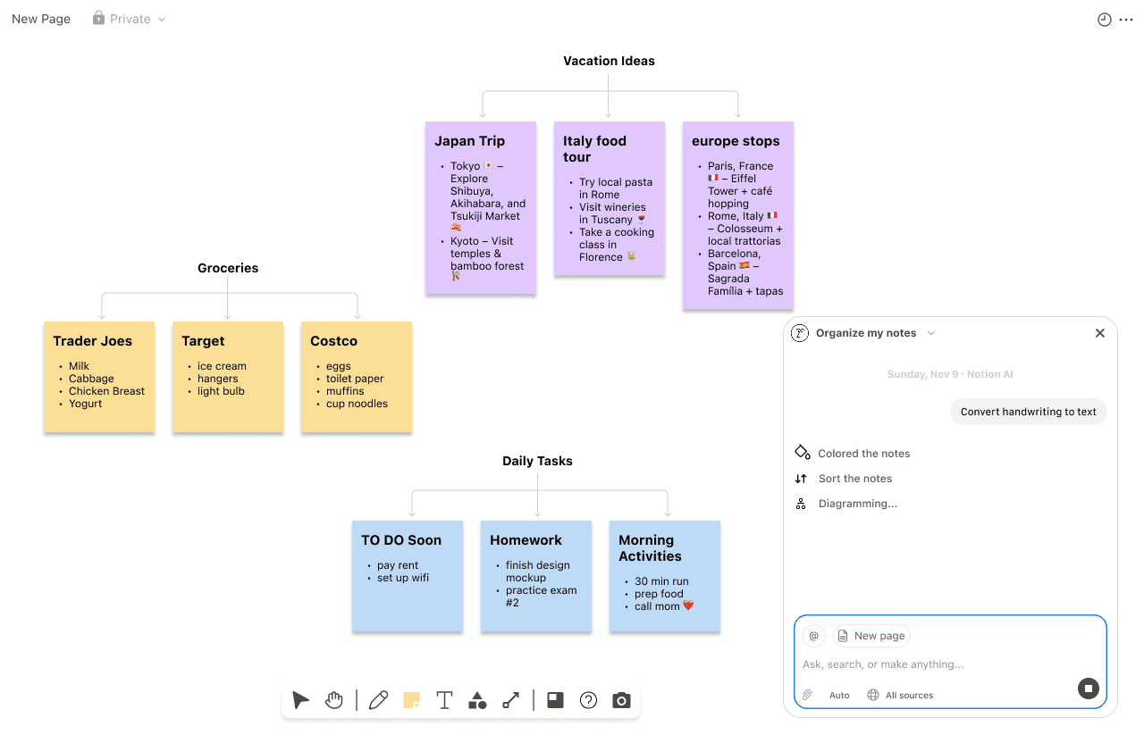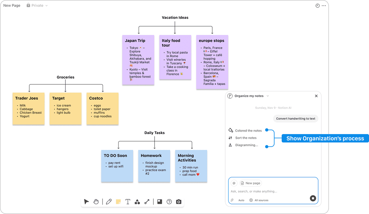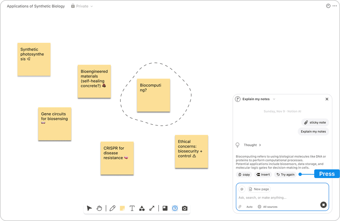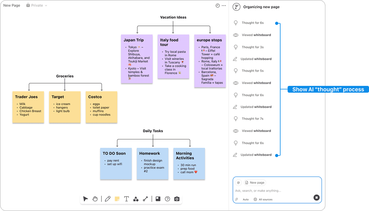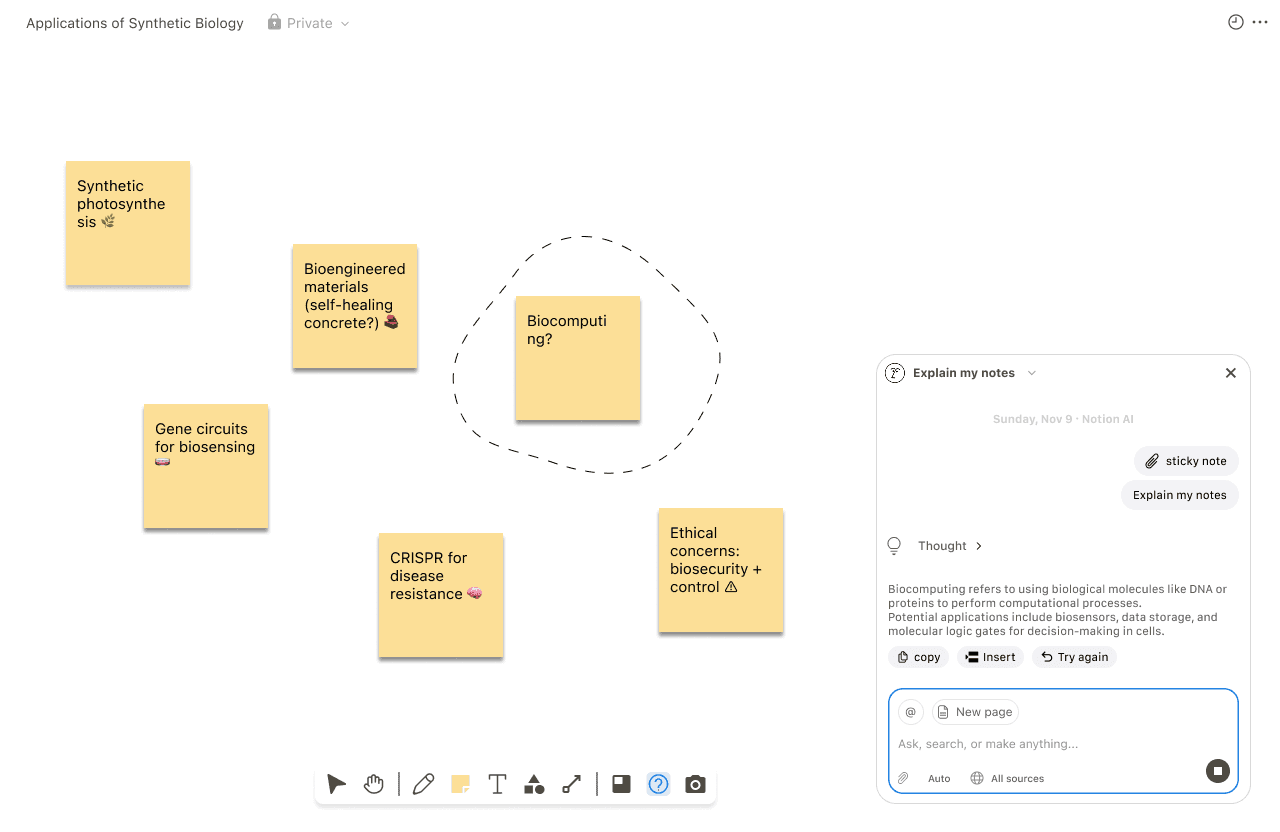 Early-stage brainstorming, sense-making, and visual exploration often feel constrained within rigid this structure. As a result, users leave Notion for external tools, breaking the promise of the all-in-one workspace.