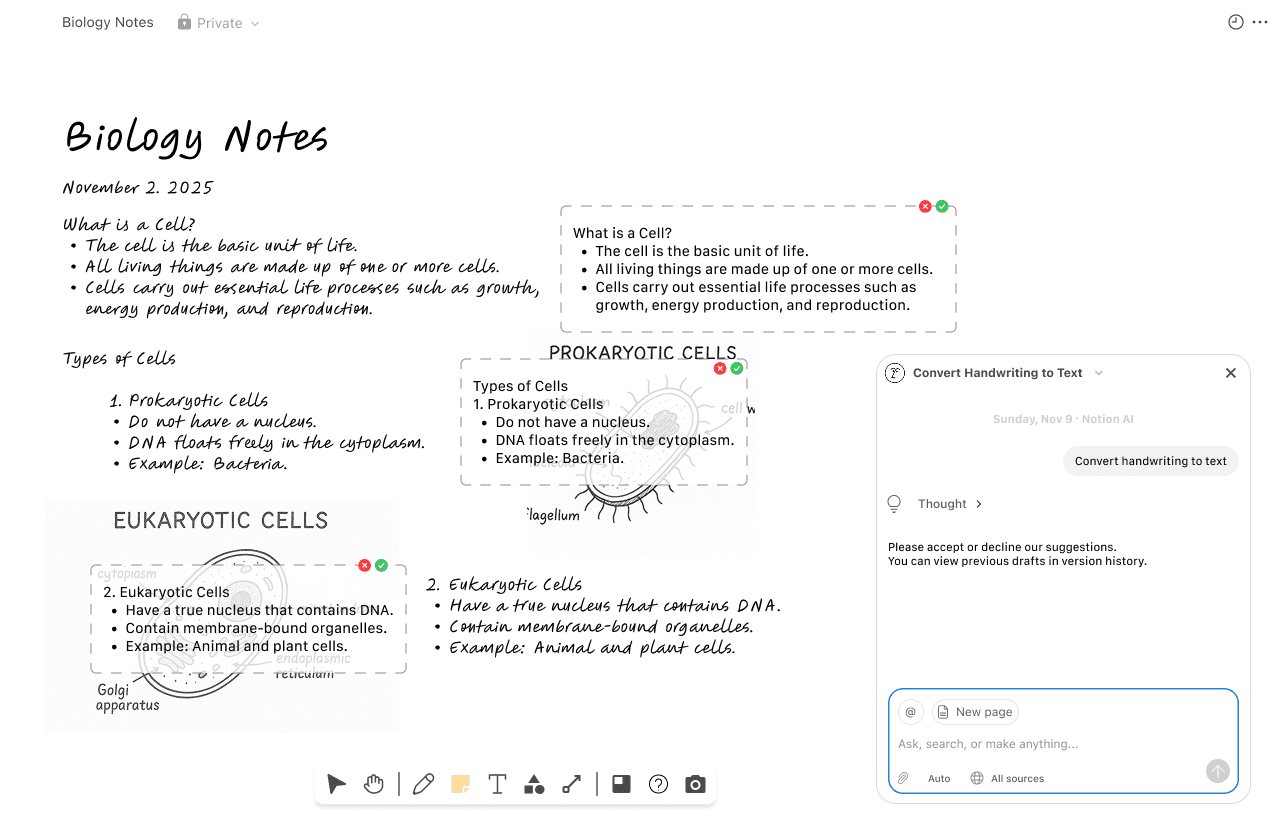 Support seamless cross-device ideation by transforming handwritten input into editable text, allowing users to selectively convert only what they choose.