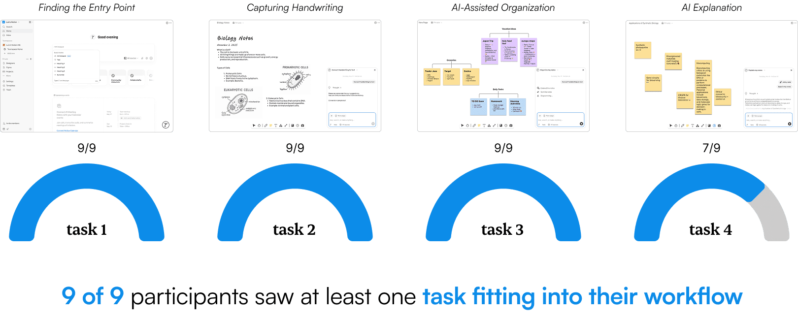 Usability testing showed that users want more control over how AI supports their productivity. Future iterations will explore adjustable AI interventions like pause-and-review flows and editable handwriting-to-text.